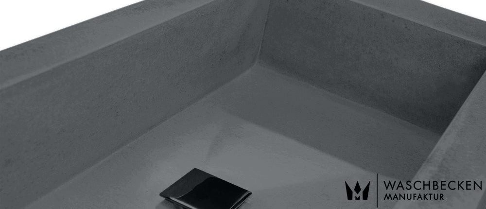Schwarz matt ist aktuell sehr gefragt. So schön diese Farbe bei Betonwaschbecken ist, so pflegeintensiv ist sie auch, denn auf schwarzen Oberflächen sieht man jeden Wasserspritzer und jeden Seifenspritzer. Wir vergleichen es immer mit einem schwarzen Auto: Frisch geputzt wunderschön, 5-mal um den Block gefahren, kann man es schon wieder putzen. Ähnlich verhält sich ein schwarz mattes Betonwaschbecken in der täglichen Nutzung.