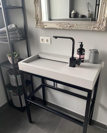 Hier sollten Sie sich vorab mit Ihrem Schreiner abstimmen, ob der Unterschrank das Gewicht des Betonwaschbeckens tragen kann. Falls nicht, hätten wir auch dafür eine passende Lösung – nehmen Sie gerne Kontakt mit uns auf.