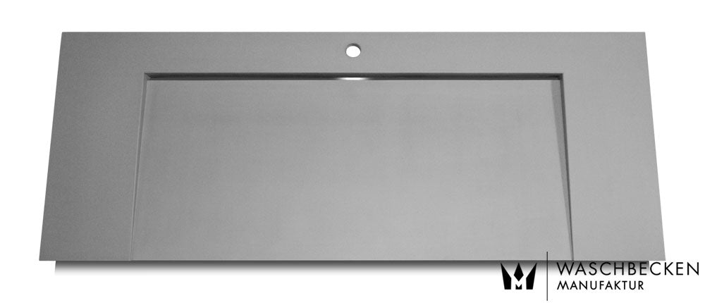 Unter dem Waschbecken befindet sich eine integrierte Ablaufrinne aus Edelstahl, mittig der Edelstahlrinne mündet ein 1 ¼ Zoll Anschlussgewinde, passend für jeden handelsüblichen Siphon.