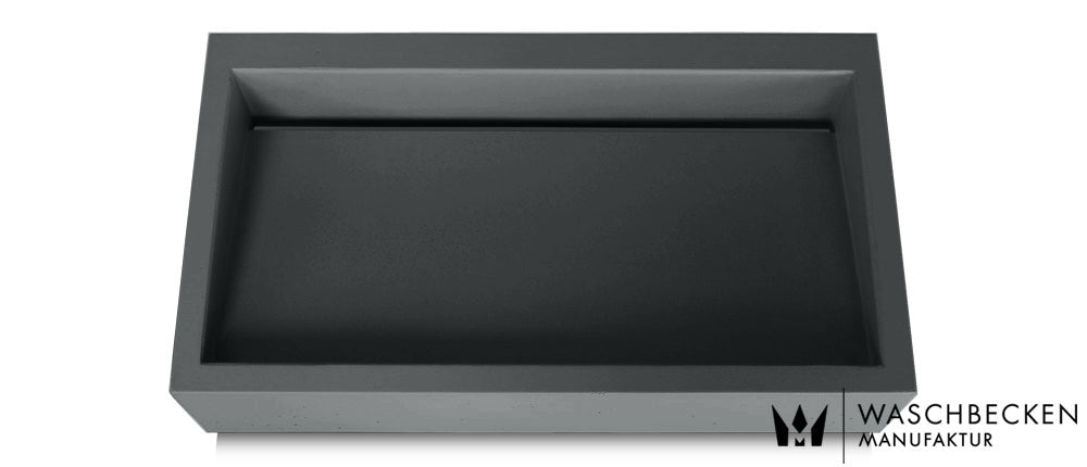 Der Grundton ist eingefärbter Beton in anthrazit, um die Oberfläche noch dunkler zu bekommen wird die Oberfläche mit unserer patentierten Betonfarbe mehrfach „lackiert“ und anschließend matt beschichtet, der Aufpreis für diese Variante beträgt € 100.-
