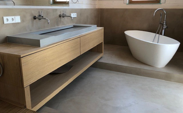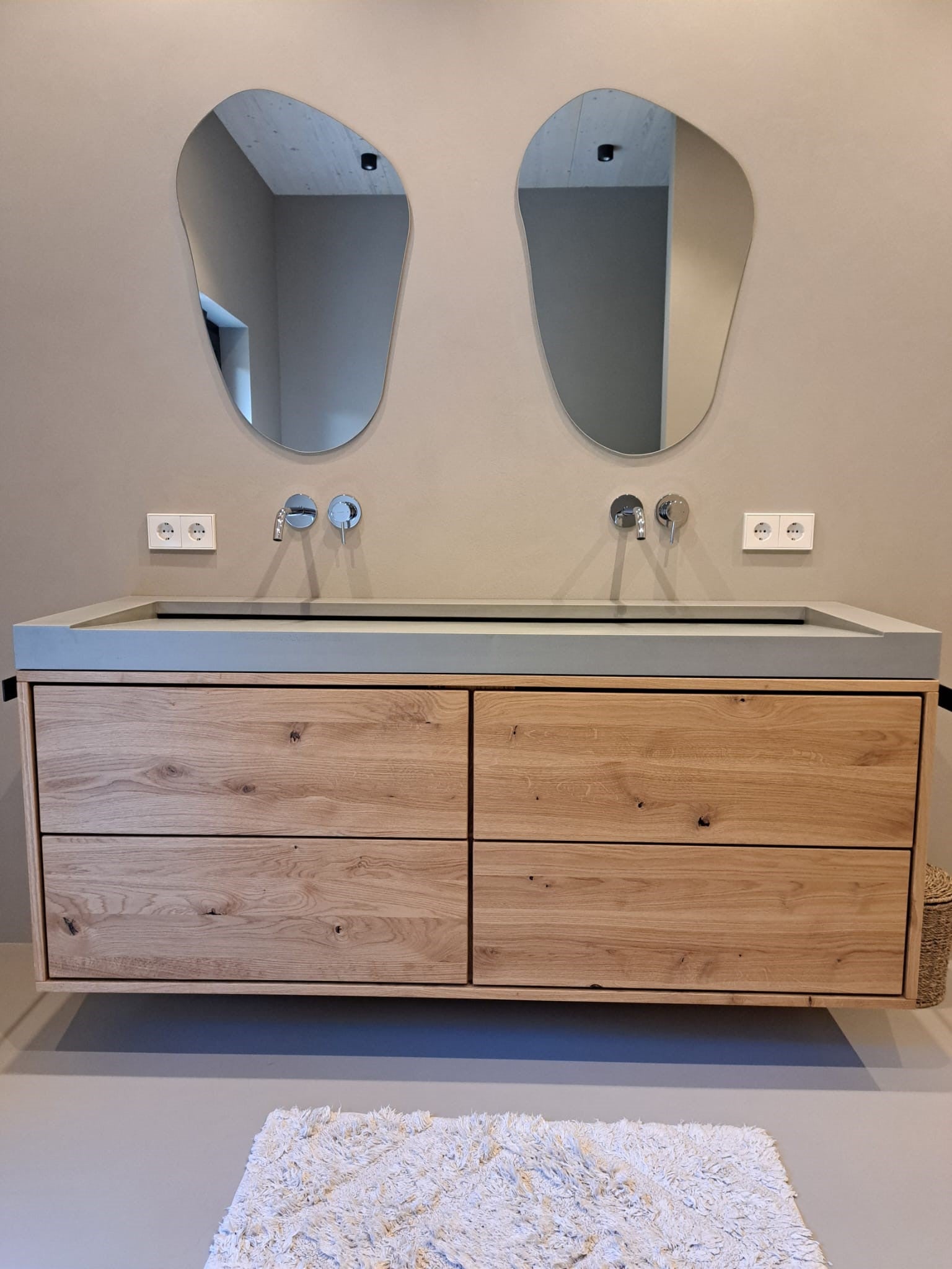 Hier sollten Sie sich vorab mit Ihrem Schreiner abstimmen, ob der Unterschrank das Gewicht des Betonwaschbeckens tragen kann. Falls nicht, hätten wir auch dafür eine passende Lösung – nehmen Sie gerne Kontakt mit uns auf.