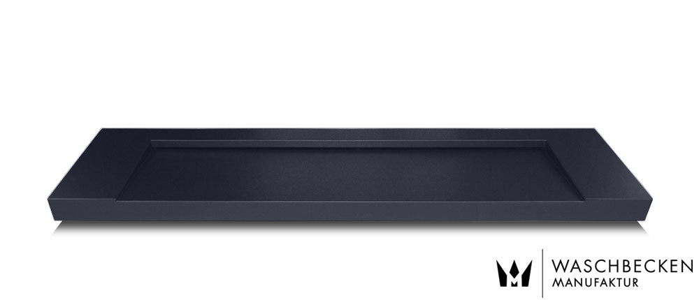 Der Grundton ist eingefärbter Beton in anthrazit, um die Oberfläche noch dunkler zu bekommen wird die Oberfläche mit unserer patentierten Betonfarbe mehrfach „lackiert“ und anschließend matt beschichtet, der Aufpreis für diese Variante beträgt € 100.-