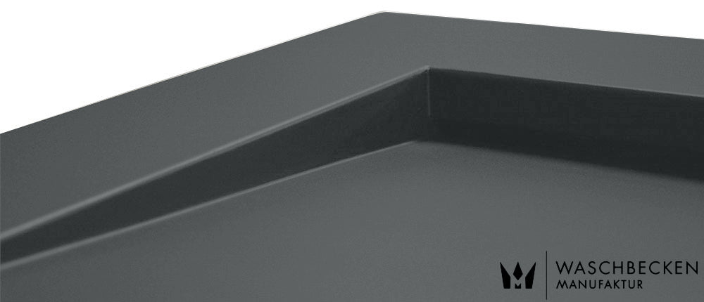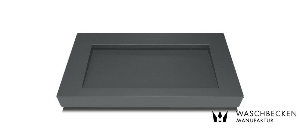 Der Grundton ist eingefärbter Beton in anthrazit, um die Oberfläche noch dunkler zu bekommen wird die Oberfläche mit unserer patentierten Betonfarbe mehrfach „lackiert“ und anschließend matt beschichtet, der Aufpreis für diese Variante beträgt € 100.-