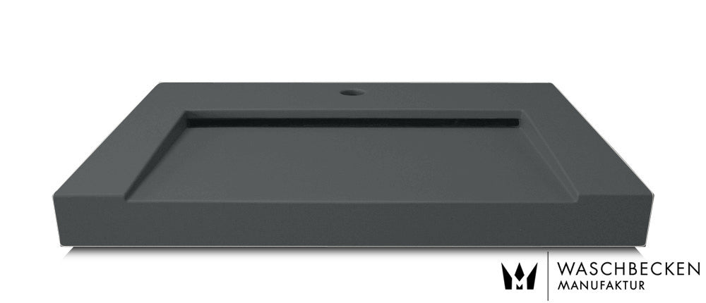Der Grundton ist eingefärbter Beton in anthrazit, um die Oberfläche noch dunkler zu bekommen wird die Oberfläche mit unserer patentierten Betonfarbe mehrfach „lackiert“ und anschließend matt beschichtet, der Aufpreis für diese Variante beträgt € 100.-